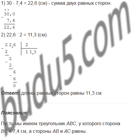 Периметр треугольника равен 30 см, одна из его сторон - 7,4 см, а две другие стороны равны между собой. Найдите длины равных сторон.