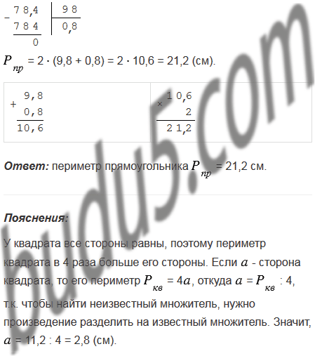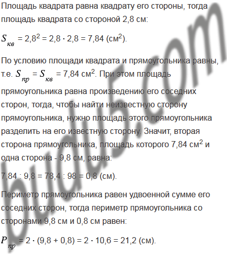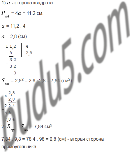 Периметр квадрата равен 11,2 см. Найдите периметр прямоугольника, площадь которого равна площади данного квадрата, а одна из сторон прямоугольника - 9,8 см.