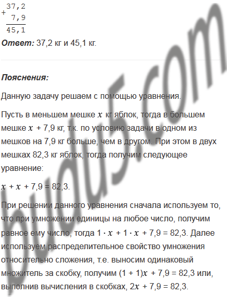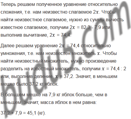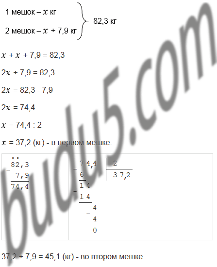 В двух мешках было 82,3 кг яблок, причем в одном мешке было на 7,9 кг больше, чем во втором. Сколько килограммов яблок было в каждом мешке?