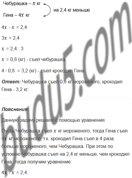 Крокодил Гена съел в 4 раза больше мороженого, чем Чебурашка. Сколько мороженого съел каждый из них, если Чебурашка съел на 2,4 кг меньше, чем крокодил Гена?