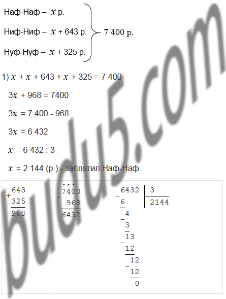 Ниф-Ниф, Нуф-Нуф и Наф-Наф купили строительные материалы для ремонта своих домиков, потратив на их приобретение 7 400 р. Найдите затраты каждого поросенка, если Ниф-Ниф заплатил на 643 р., а Нуф-Нуф - на 325 р. больше, чем Наф-Наф.