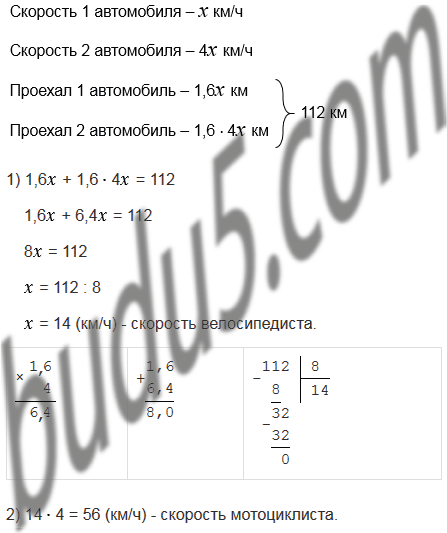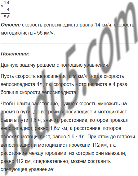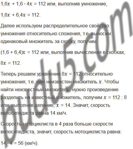 Из двух городов, расстояние между которыми равно 112 км, навстречу друг другу одновременно выехали мотоциклист и велосипедист. Найдите скорость каждого из них, если они встретились через 1,6 ч после выезда и скорость мотоциклиста в 4 раза больше скорости велосипедиста.