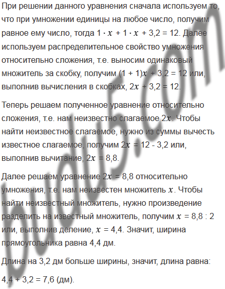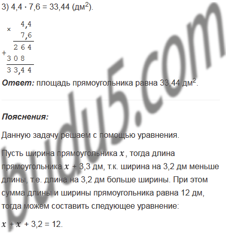 Сумма длины и ширины прямоугольника равна 12 дм, причем ширина на 3,2 дм меньше длины. Вычислите площадь прямоугольника.
