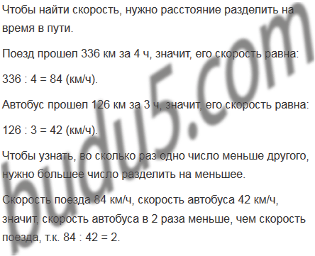 Поезд прошел 336 км за 4 ч, а автобус - 126 км за 3 ч. Во сколько раз скорость автобуса меньше скорости поезда?