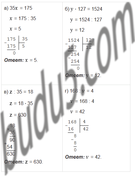 а) 35 = 175;         б) 127 = 1524;         в) : 35 = 18;         г) 168 : = 4.