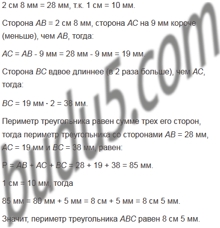 Найдите периметр треугольника АВС, если ВС вдвое длиннее, чем АС, АВ = 2 см 8 мм, АС на 9 мм короче, чем АВ.