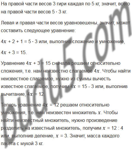 Составьте уравнение по рисунку 52 (масса гирь дана в килограммах) и найдите массу каждого пакета.