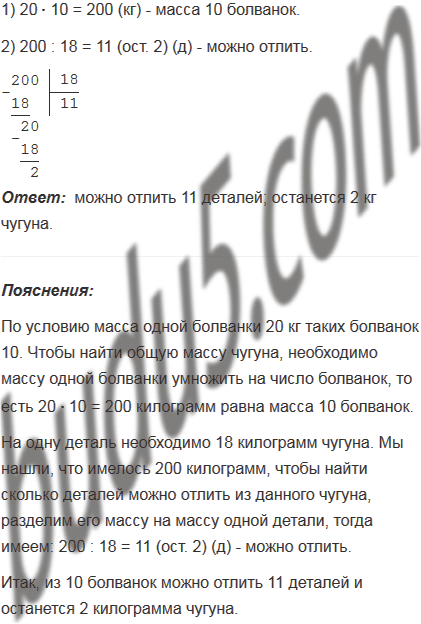 Масса чугунной болванки 20 кг. Сколько деталей по 18 кг можно отлить из 10 болванок? Сколько чугуна останется?