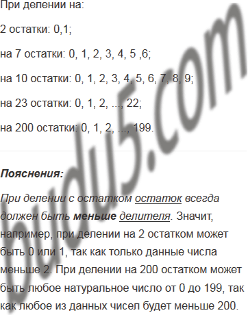 Какие остатки могут получиться при делении различных чисел на 2; на 7; на 10; на 23; на 200?
