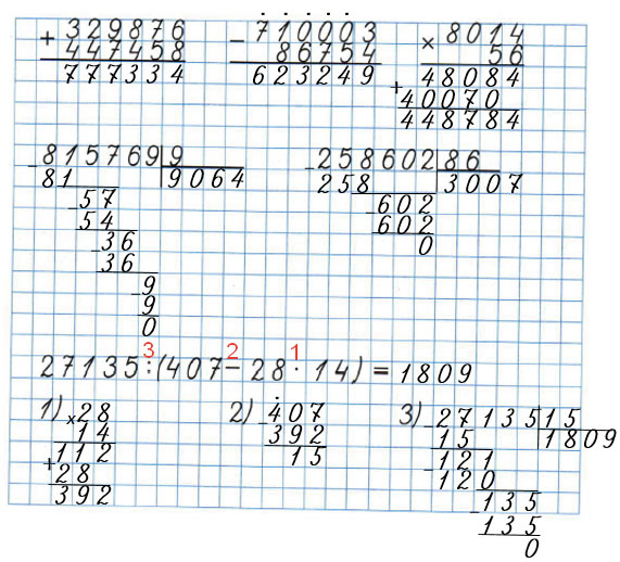 Пишу (единицы под единицами, десятки под десятками, сотни под сотнями, единицы тысяч под единицами тысяч, десятки тысяч под десятками тысяч, сотни тысяч под сотнями тысяч): 329876 + 447458.