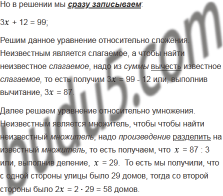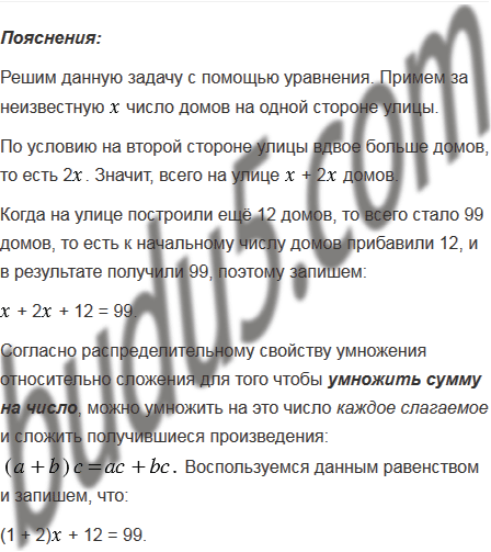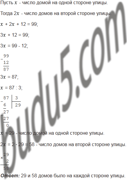 На одной стороне улицы вдвое больше домов, чем на другой. Когда на улице построили ещё 12 домов, то всего стало 99 домов. Сколько домов было на каждой стороне улицы?