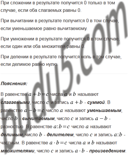 При сложении каких чисел может получится 0? Подумайте, в каких случаях получится число 0 при вычитании, при умножении, при делении.