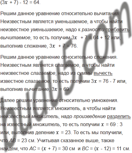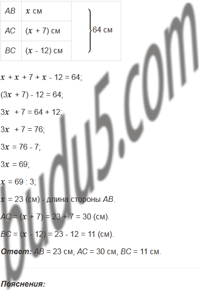 Периметр треугольника АВС равен 64 см, сторона АВ меньше стороны АС на 7 см, но больше стороны ВС на 12 см. Найдите длину каждой стороны треугольника АВС.