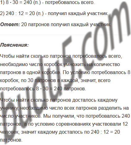 В соревнованиях по стрельбе участвовали 12 человек. Сколько патронов получил каждый участник, если потребовалось 8 коробок, по 30 патронов в каждой?