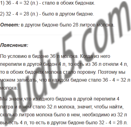 В бидоне 36 л молока. Когда из него перелили в другой бидон 4 л, в обоих бидонах молока стало поровну. Сколько литров молока было в другом бидоне?