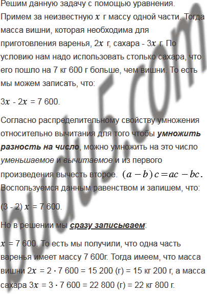 Для приготовления вишнёвого варенья на 2 части вишни берут 3 части сахара (по массе). Сколько вишни и сколько сахара пошло на варенье, если сахара пошло на 7 кг 600 г больше, чем вишни?