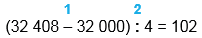 1) 32 408 - 32 000 = 408 2) 408 : 4 = 102 |