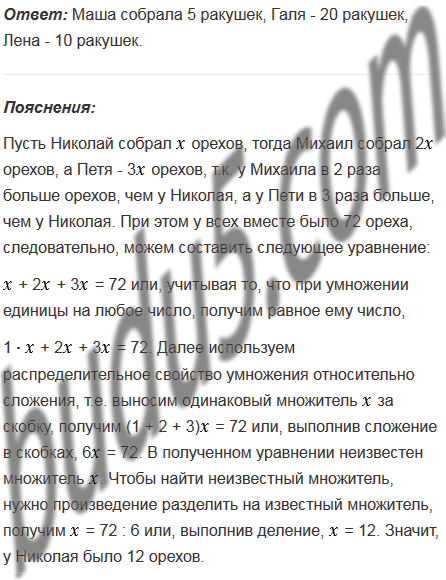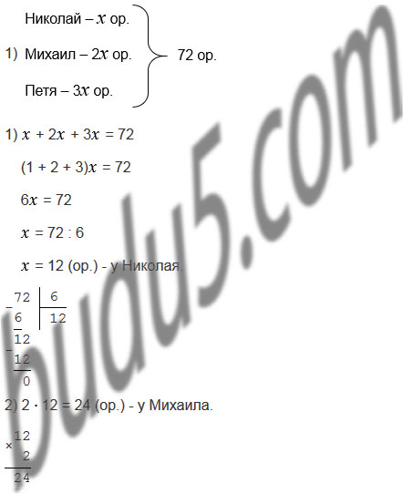 1) У Михаила в 2 раза больше орехов, чем у Николая, а у Пети в 3 раза больше, чем у Николая. Сколько орехов у каждого, если у всех вместе 72 ореха?