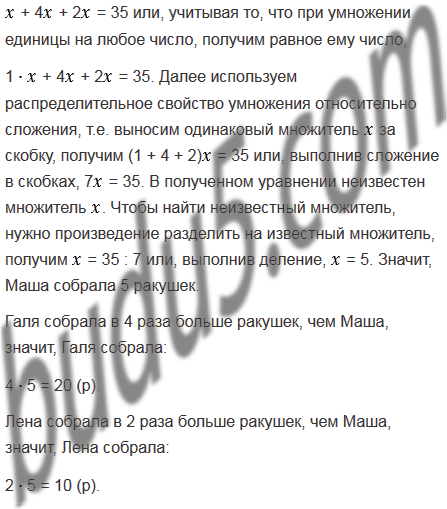 2) Три девочки собрали на берегу моря 35 ракушек. Галя нашла в 4 раза больше, чем Маша, а Лена - в 2 раза больше, чем Маша. Сколько ракушек нашла каждая девочка?