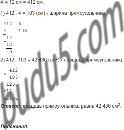 Найдите площадь прямоугольника, если его длина равна 4 м 12 см, а ширина в 4 раза меньше.