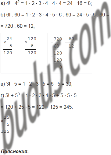 а) 4! - 42;     б) 6! : 60;     в) 3!5;     г) 5! + 53.