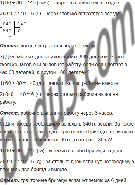 Расстояние между двумя городами 840 км. Одновременно навстречу друг другу из этих городов вышли два поезда. Один идёт со скоростью 60 км/ч, а другой - со скоростью 80 км/ч. Через сколько часов эти поезда встретятся? Придумайте и решите похожую задачу:
