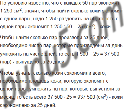 Благодаря рационализаторскому предложению удалось сэкономить на каждых 50 парах ботинок 1250 см2 кожи. Сколько кожи сэкономлено за 25 рабочих дней, если каждый день выпускает 1500 пар ботинок?