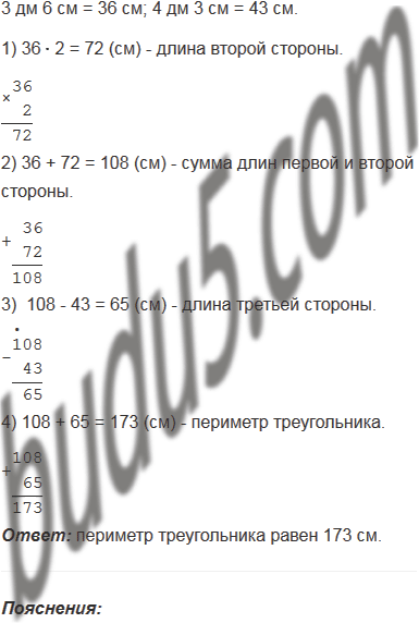 Одна из сторон треугольника имеет длину 3 дм 6 см, а другая вдвое длиннее. Длина третьей стороны на 4 дм 3 см меньше, чем сумма длин первых двух сторон. Найдите периметр треугольника.