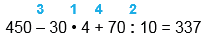 1) 30 • 4 = 120 2) 70 : 10 = 7 3) 450 - 120 = 330 4) 330 + 7 = 337 |
