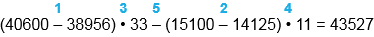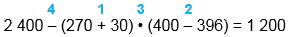 1) 270 + 30 = 300 2) 400 - 396 = 4 3) 300 • 4 = 1 200 4) 2 400 - 1 200 = 1 200 |