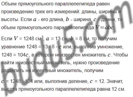 Объем прямоугольного параллелепипеда 1248 см3. Его длина 13 см, а ширина 8 см. Найдите высоту параллелепипеда.