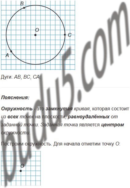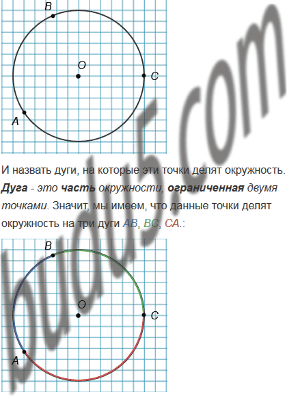 Начертите окружность и отметьте на ней три точки А, В и С. Назовите дуги, на которые эти точки делят окружность.