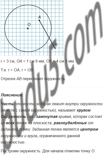 Изобразите круг, радиус которого 3 см. Отметьте точку А внутри круга и точку В вне круга. Измерьте расстояние от центра круга до точки А и до точки В. Сравните эти расстояния с радиусом круга. Соедините точки А и В отрезком. Пересекается ли он с окружностью?