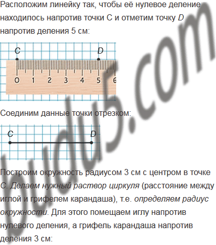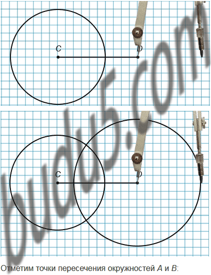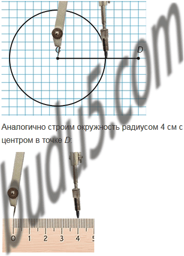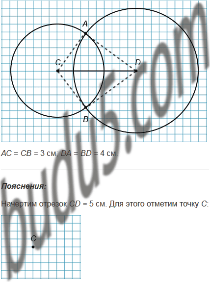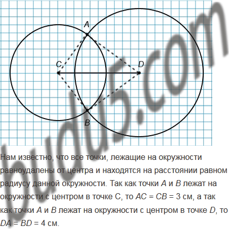 Начертите отрезок CD, равный 5 см. Проведите окружность с центром С и радиусом 3 см, а также другую окружность с центром D и радиусом 4 см. Обозначьте точки пересечения окружностей буквами А и В. Чему равны длины отрезков АС, СВ, DA и BD?