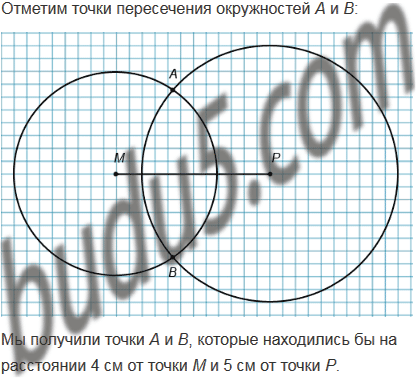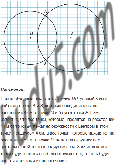 Начертите отрезок МР, равный 6 см. Найдите две точки А и В, которые находились бы на расстоянии 4 см от точки М и 5 см от точки Р.