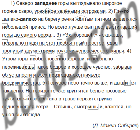 1) Северо(западнее) горы выглядывало широкое горное озеро усея(н, нн)ое зелёными островами. 2) Где(то) дале-ко(далеко) на берегу речки ж..лтым пятном выделялся (н..)большой прииск. Но всего лучше был лес выстилавший горы до самого верха... 3)Эх, хорошо!.. скажешь (н..)вольно глядя на этот (н..)объятный простор едва тронутый двумя(тремя) точками человеческого жилья. 4) Утром горы (н..)обыкнове(н, нн)о хороши и (н..)вольно пережива..шь такое бодрое и хорошее чувство забывая об усталости и всех (н-.)взгодах охотничьего бродяжничества. 5) Голубое небо точно выше, и дыш..тея так легко. На горизонте уже круглятся белые грозовые тучки где(то) заш..птала в траве первая струйка поднявшегося ветра... Стоишь, смотр..шь и, кажется, не ушёл бы (от)сюда.