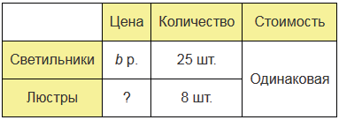 В магазин купили 25 светильников, по b р., и 8 люстр. Стоимость обеих покупок одинаковая. Чему равна цена люстры?