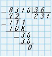 После деления второго делимого в частном получилось 3. 36 • 3 = 108. Значит, получилось разделить 108. После того, как из второго неполного делимого вычли 108, остаток - однозначное число. Значит, второе неполное делимое - 111.