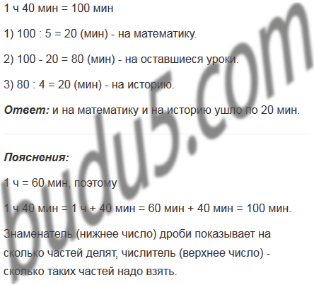 Петя готовил уроки 1 ч 40 мин. На математику он потратил