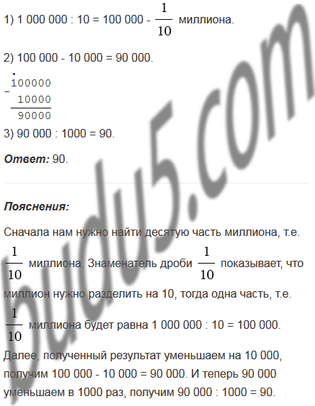 Десятую часть миллиона уменьшили на 10 000 и результат уменьшили в тысячу раз. Сколько получили?