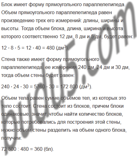 Бетонный блок имеет длину 12 дм, ширину 8 дм и высоту 5 дм. Из таких блоков сложили стену длиной 240 дм, шириной 24 дм и высотой 30 дм. Сколько блоков потребовалось для этого?