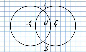 1) Отложи на прямой отрезок АВ. Радиусом, равным больше половины длины отрезка, проведи 2 окружности с центрами в точках А и В (чертёж 1). Обозначь точки пересечения окружностей буквами С и D.