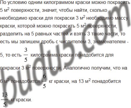 Одним килограммом краски можно покрасить 5 м2 поверхности. Сколько понадобится краски, чтобы покрасить 3 м2; 6 м2; 13 м2 поверхности?