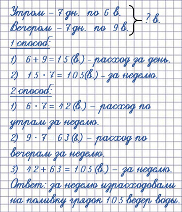 3. Ежедневно на поливку грядок расходовали утром 6 вёдер воды, а вечером 9 вёдер. Сколько вёдер воды израсходовали на поливку грядок за неделю? Реши задачу двумя способами.