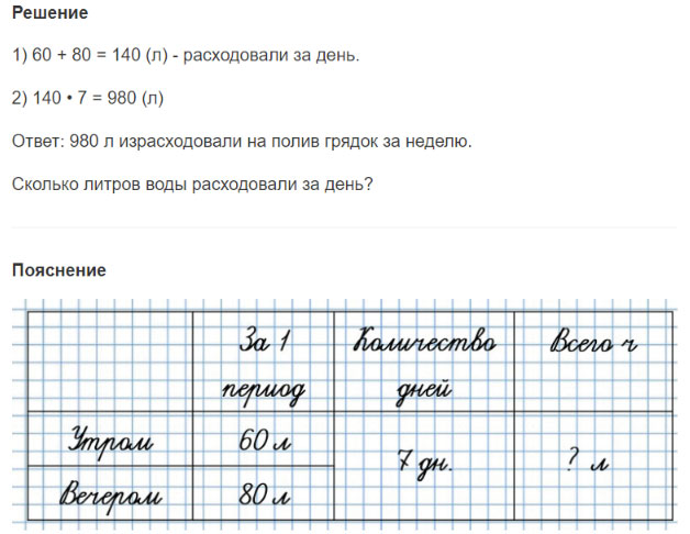 3. При автоматическом поливе грядок утром расходовали 60 л воды, а вечером - 80 л. Сколько литров израсходовали на полив грядок за неделю? Реши задачу. Измени вопрос задачи так, чтобы в задаче был ответ: на 140 л.