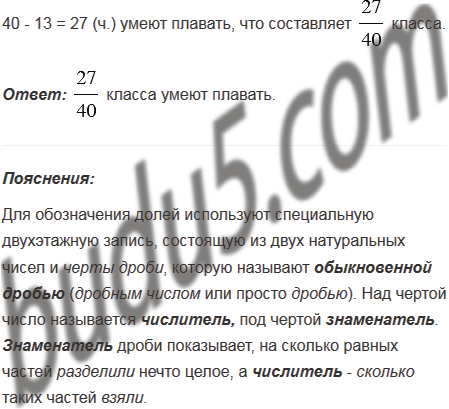 В классе 40 человек. Из них 13 человек ещё не научились плавать. Какая часть учащихся класса умеет плавать?