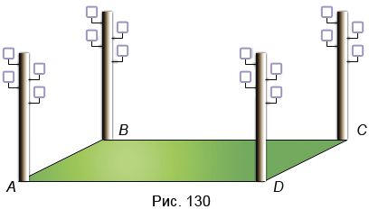 В углах квадратной площадки установлены одинаковые столбы с четырьмя изоляторами для крепления проводов (рис. 130). Надо протянуть по два провода от столба А к столбу С и от столба В к столбу D так, чтобы провода не касались друг друга. Найдите несколько способов, как это можно сделать.