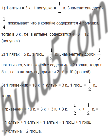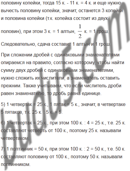 Подумайте, сколько полушек в алтыне. Сколько грошей в пятаке? Как гривенник можно разменять на алтыны и гроши? Сколько сдачи с пятиалтынного надо получить при покупке стоимостью в гривенник и три гроша? Сколько пятаков в четвертаке? Почему 25 к. назвали четвертаком, а 50 к. - полтинником?