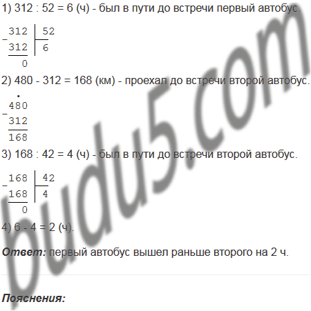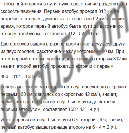 Два автобуса вышли в разное время навстречу друг другу из двух городов, расстояние между которыми 480 км. Скорость первого автобуса 52 км/ч, а скорость второго 42 км/ч. Пройдя 312 км, первый автобус встретился со вторым. На сколько часов первый автобус вышел раньше второго?