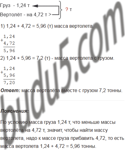 Груз, поднимаемый вертолётом, легче вертолёта на 4,72 т. Какова масса вертолёта вместе с грузом, если масса груза 1,24 т?